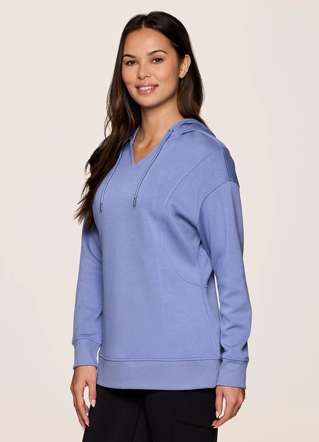 Relax and reset in our LuxeSoft V-Neck Hoodie. Super soft, lightweight LuxeSoft fabric with seaming detail keeps you on trend and feeling great from the yoga studio and gym to dog walks, school pick-ups and more. A breathable relaxed fit combines with dropped shoulders for long lasting comfort, plus wrist cuffs allow for optimal sleeve scrunching for a cozy fit. With a longer length that’s legging friendly and perfect for layering or wearing on its own, this hoodie tunic pullover brings style into any athleisure wardrobe.