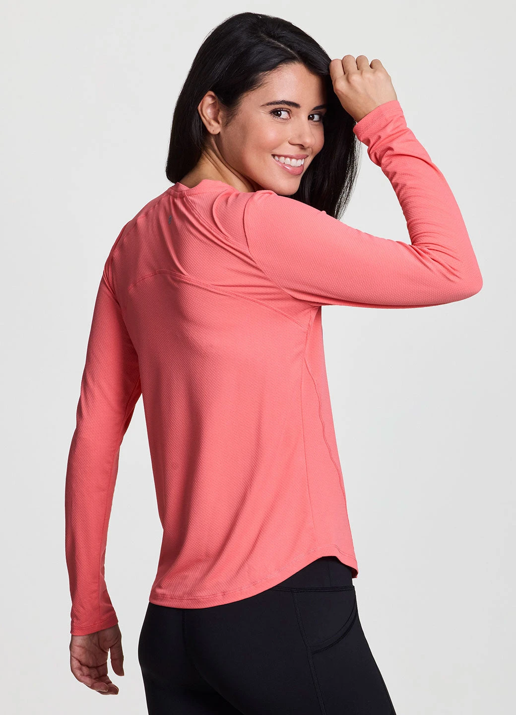Our On The Go Running Tee is constructed from a lightweight, quick drying closed mesh fabric that helps promote air flow and breathability so you can stay cool and dry while the workout heats up. A classic crewneck design, easy fit and a length that lands at the hips combine with sporty details like dropped shoulders and seaming throughout to create a cute, all-season long sleeve workout top your active wardrobe needs.