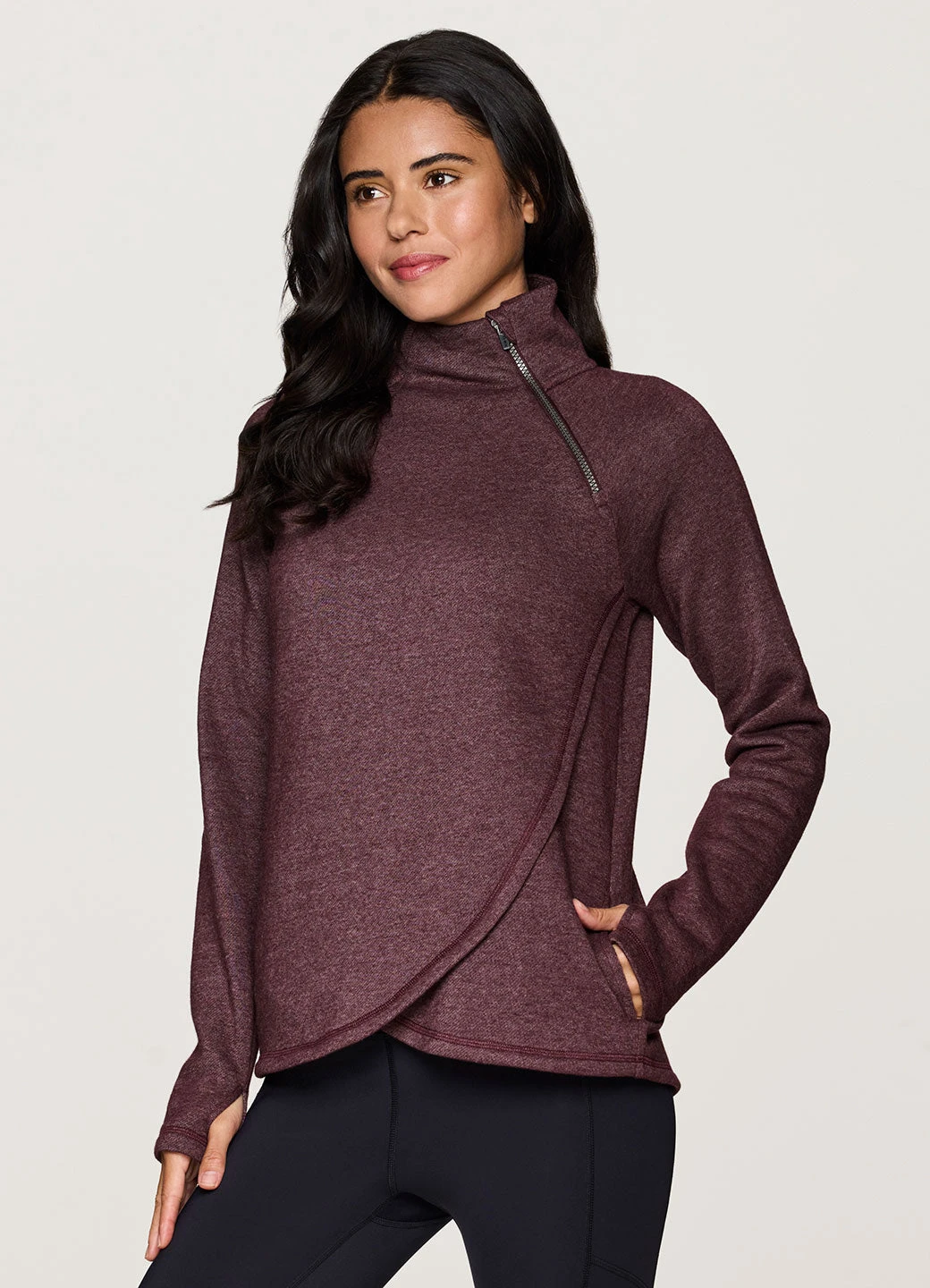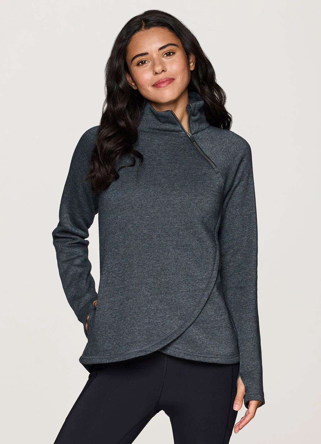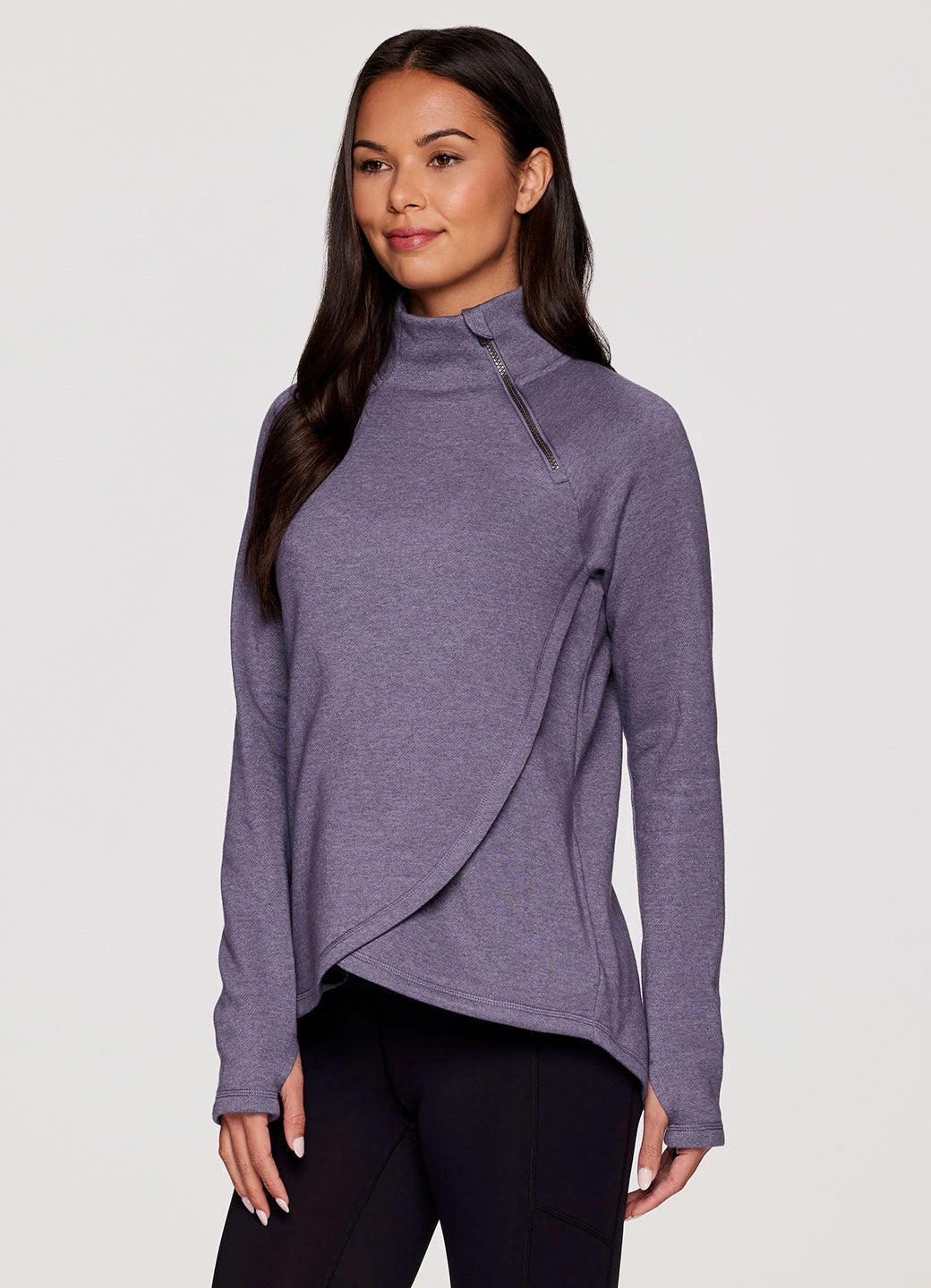 Hang out in comfort and style with the Prime Ready To Roll Fleece Zip Mock Pullover sweatshirt. Its faux wrap hemline creates a flattering, feminine fit while also adding a subtle fashionable detail. The cotton blend fleece fabric is soft and breathable. The asymmetric zip mock neck allows for a customizable fit while providing extra comfort and warmth. Finished with convenient side pockets and thumbholes on the sleeves, this top will be your new go to sweater for those colder weather months. Available in sizes XS-3X.