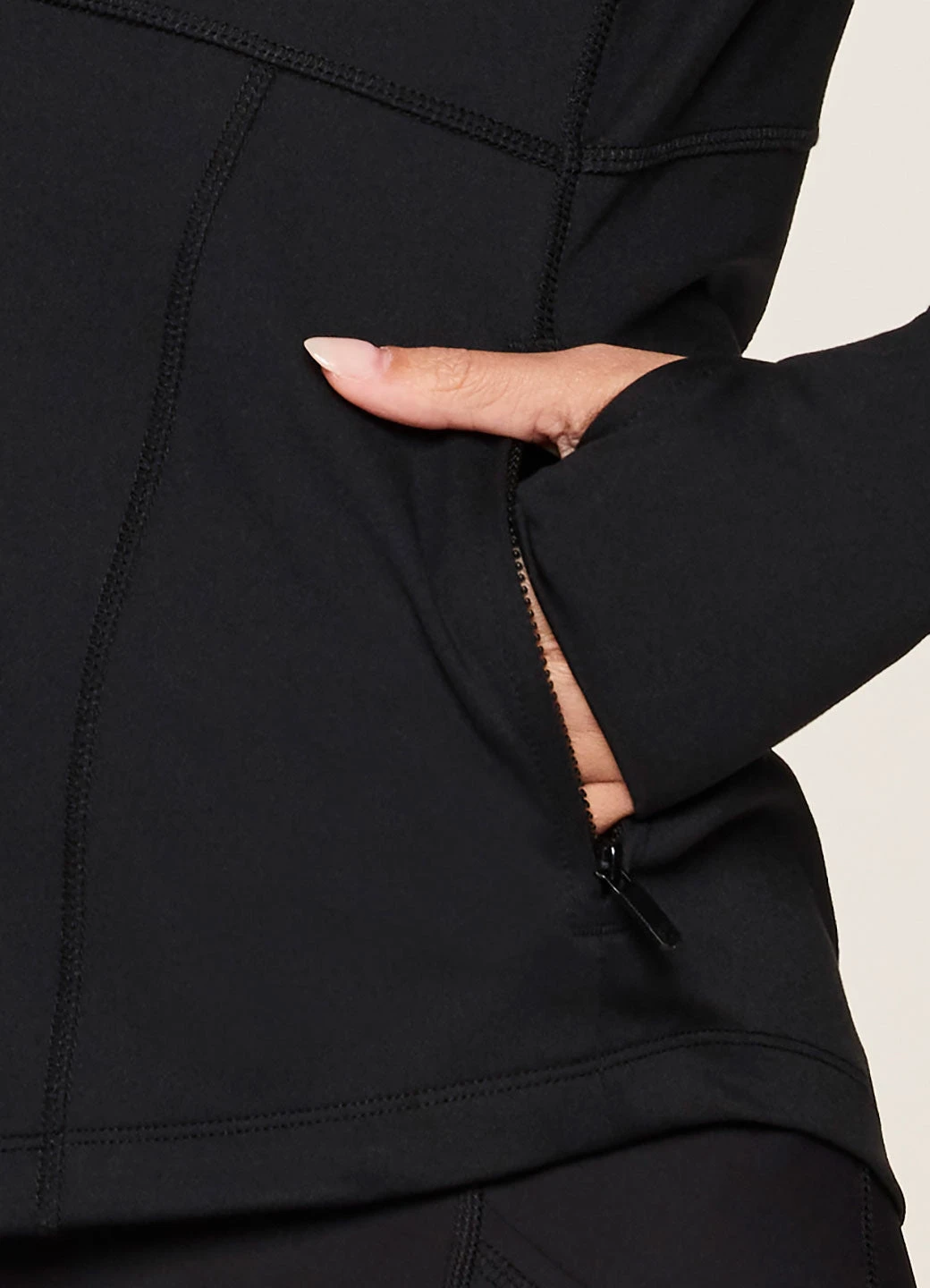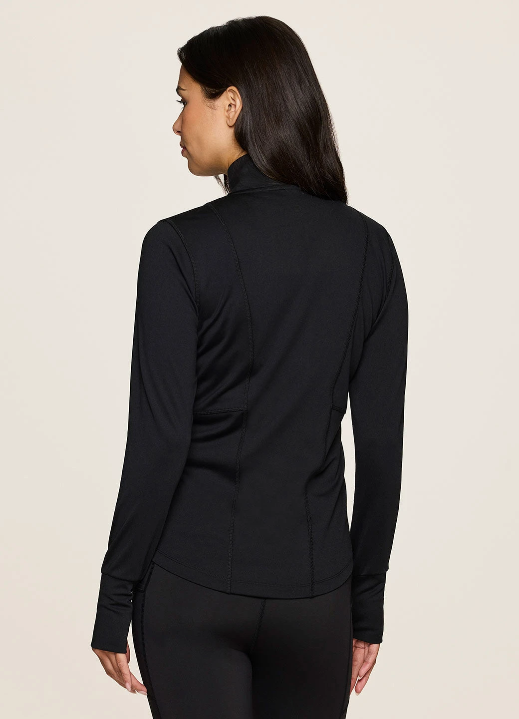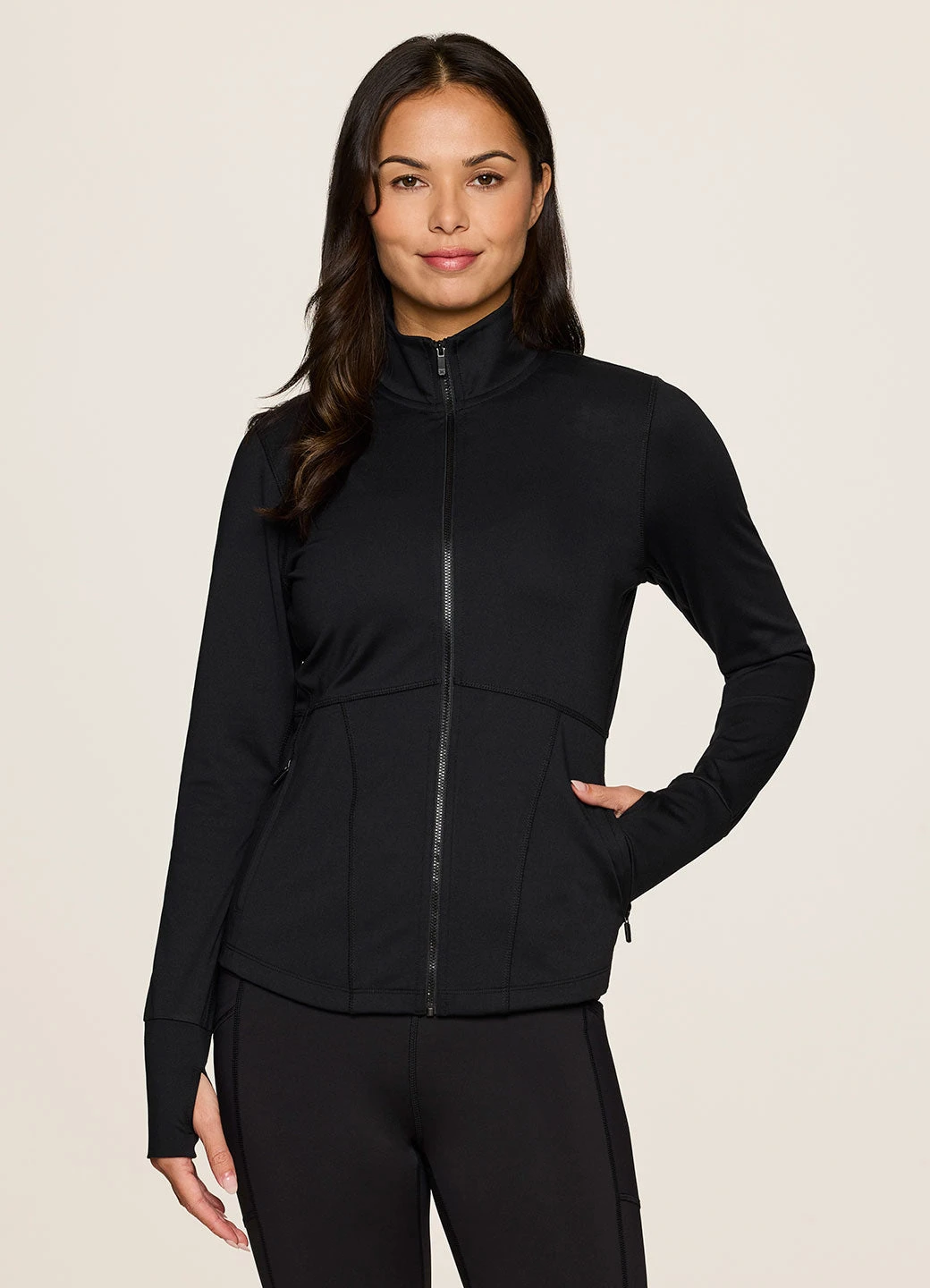 Our Sculpt It Studio Jacket combines versatility and style to create the perfect transitional active jacket you can wear anywhere. It is constructed from a smooth, soft stretch fabric that’s ultra durable and has two zipper pockets to tuck your hands into or to securely hold your ear buds, keys and other essentials. A full zip, mock neck design combines with thumbholes on each sleeve to help keep everything in place and covered while you move. Finished with sporty seaming detailing throughout, you’ll look as good as you feel in this lightweight zip up jacket.
