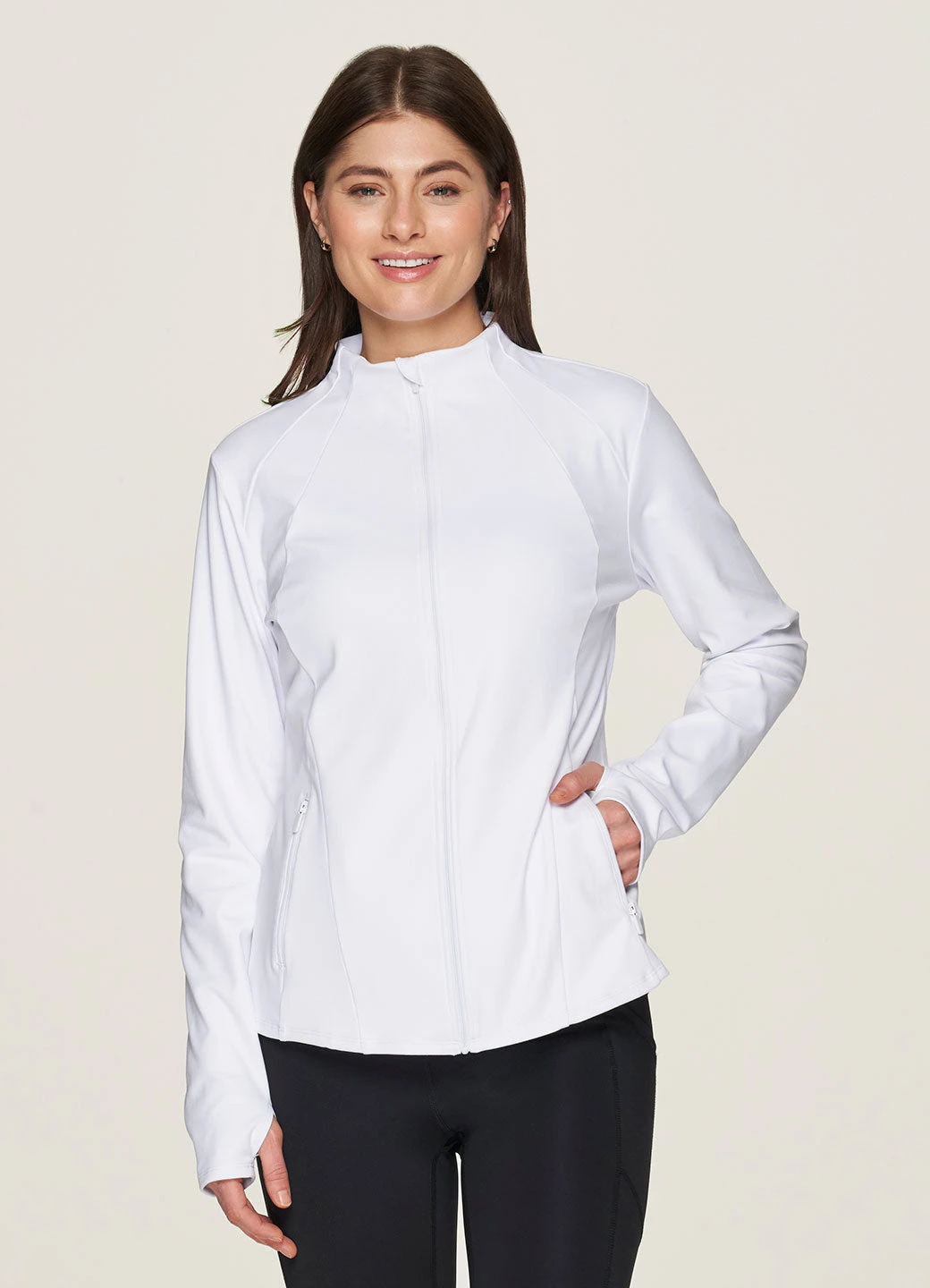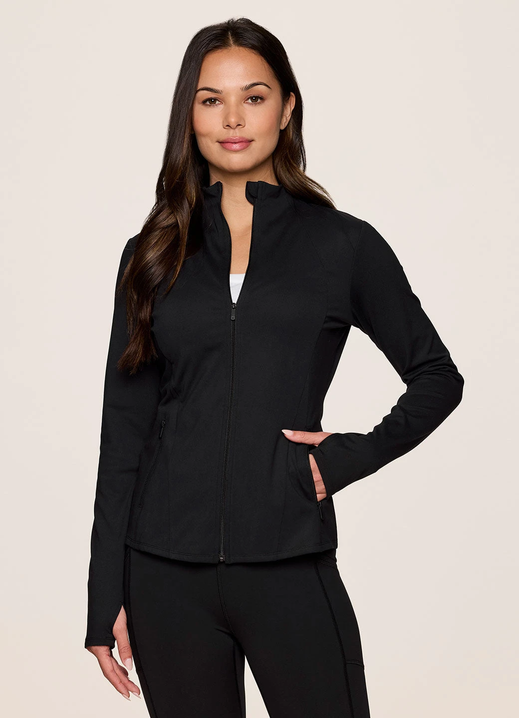 Perfect for the gym, yoga studio, dog walks and more, our Studio Daily Super Soft Mock Neck Jacket is made for your on-the-go lifestyle. This lightweight zip up jacket features two zipper pockets so you can securely carry your phone, keys and other essentials with confidence. A regular length and fit combine with flattering seaming detail and buttery soft stretch fabric for a transitional jacket that moves with you. Complete with thumbholes on each sleeve and a mock neckline, this running jacket is a no-brainer for your active wardrobe!