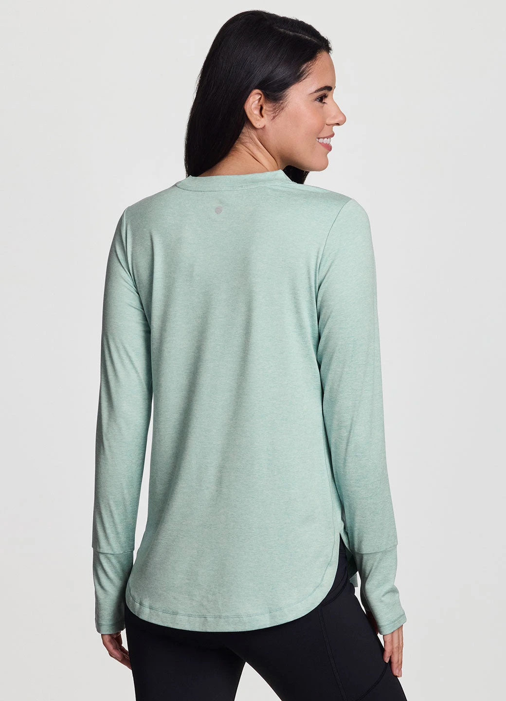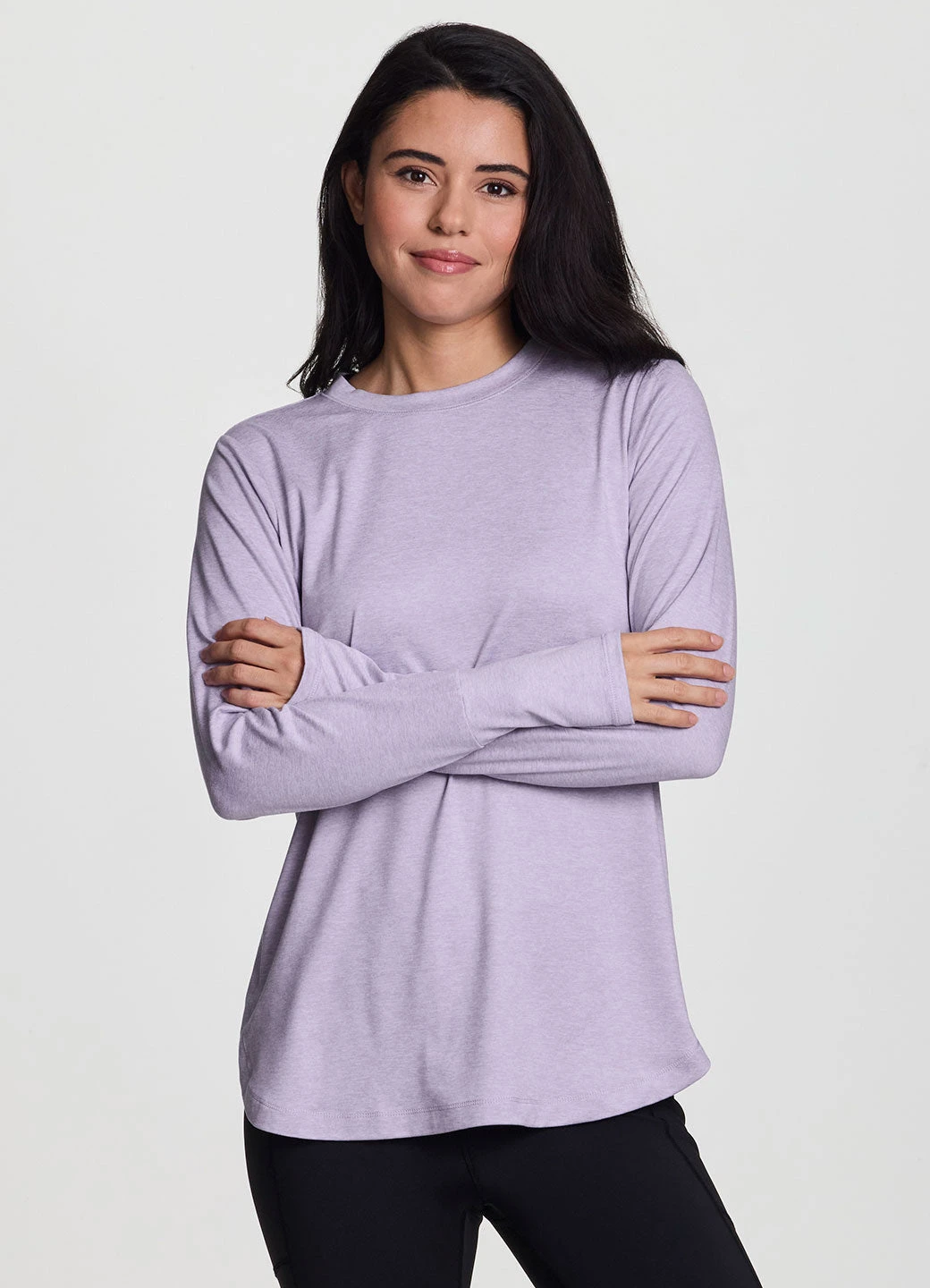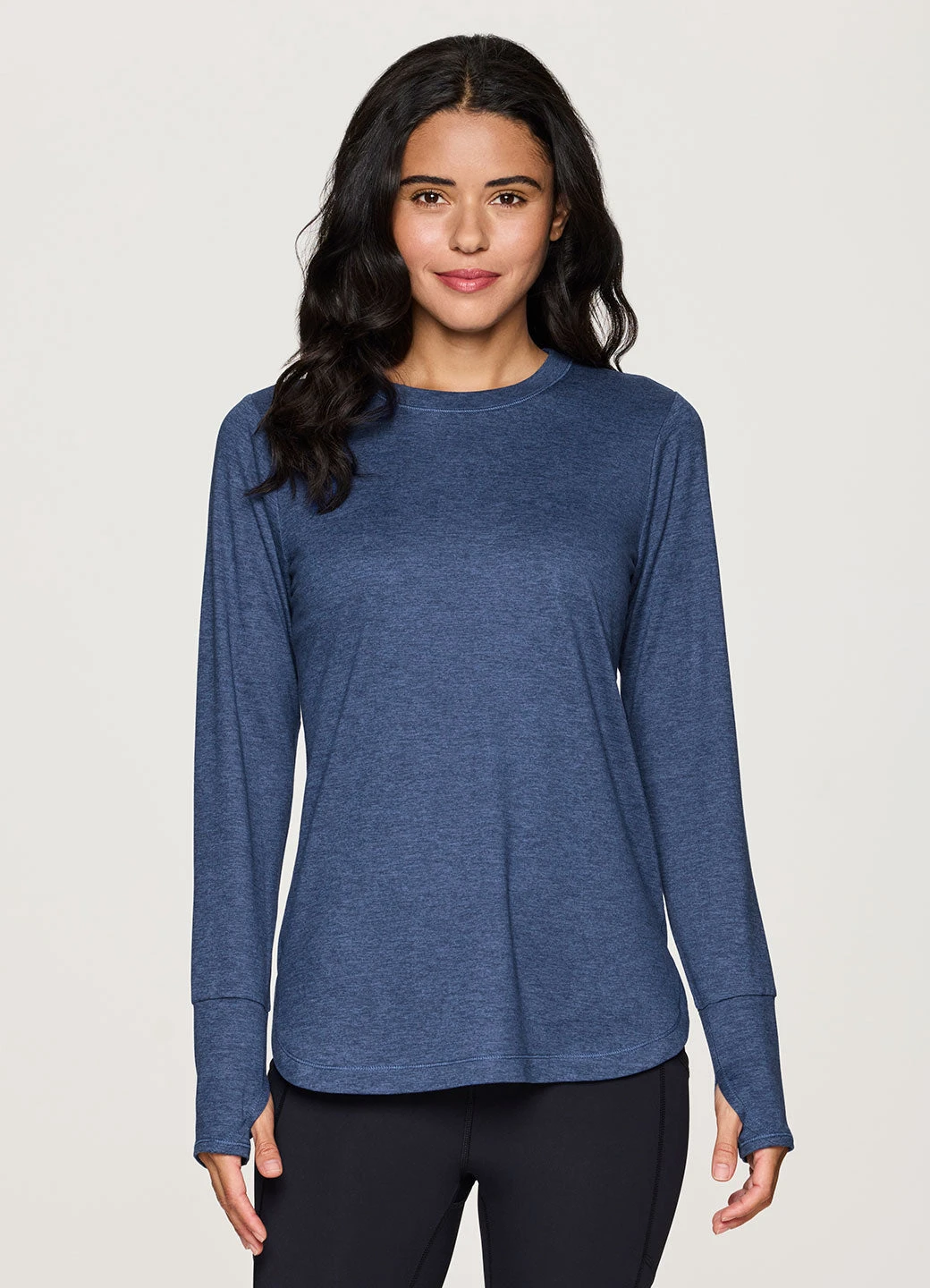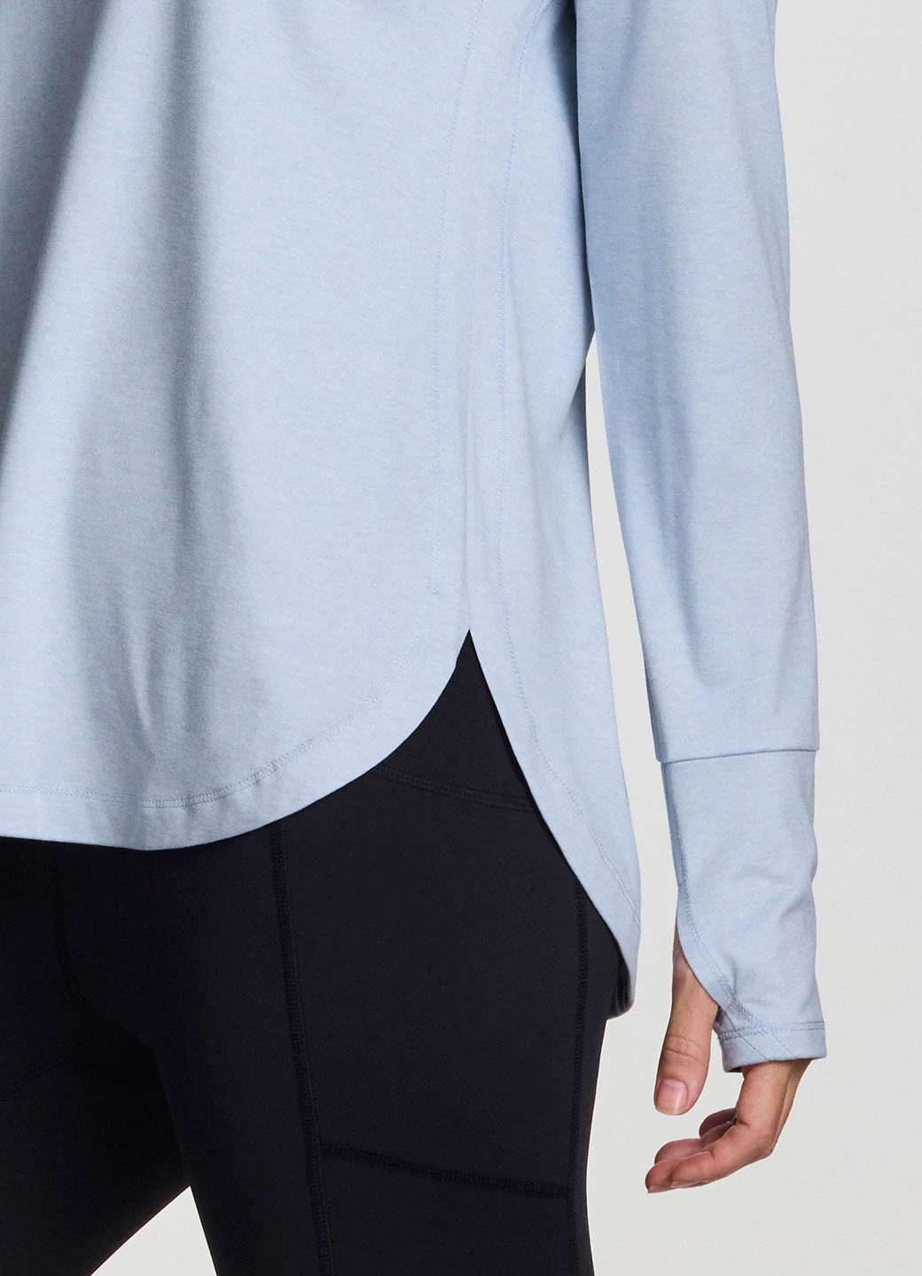 Practice your poses in our Studio Practice Long Sleeve Tunic Tee. With its longer tunic-length design and side slits, this long sleeve t-shirt fits comfortably and provides coverage in the areas you want it most. The super soft, stretchy peached fabric feels smooth and drapes your body for a flattering and comfortable fit. Finished with thumbholes to help keep sleeves in place for a full range of distraction-free movement, you can wear this training top to any workout.